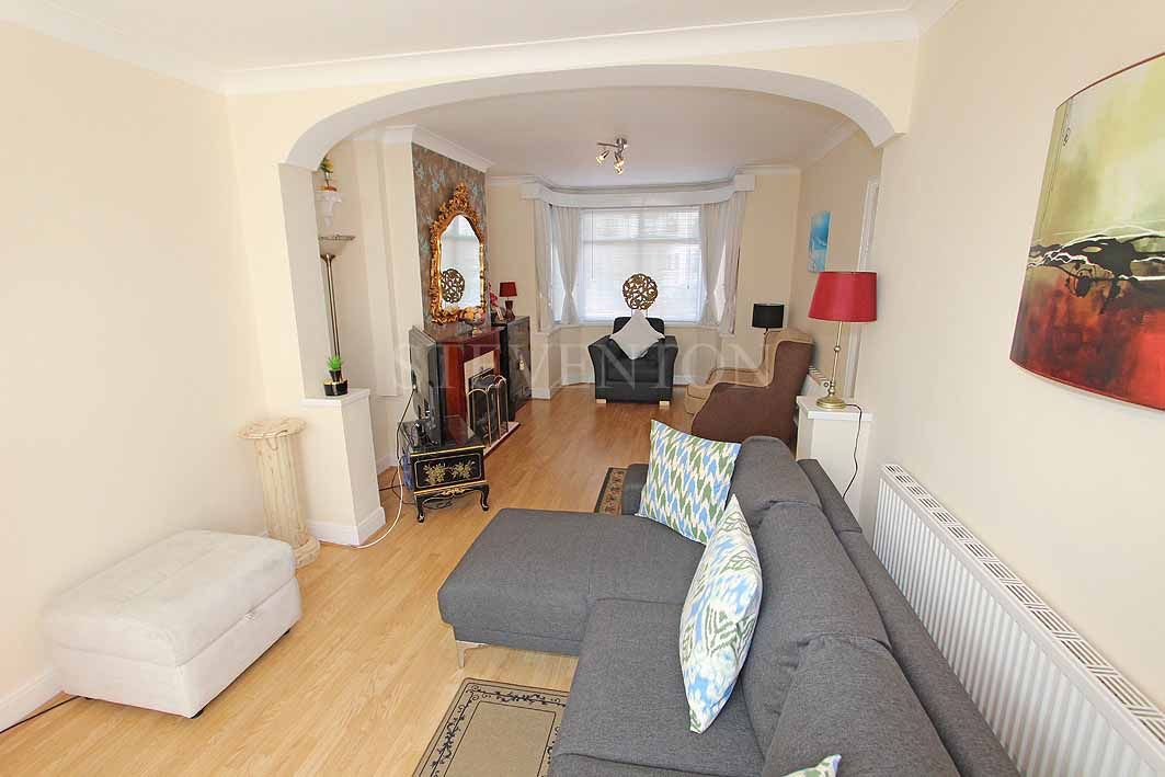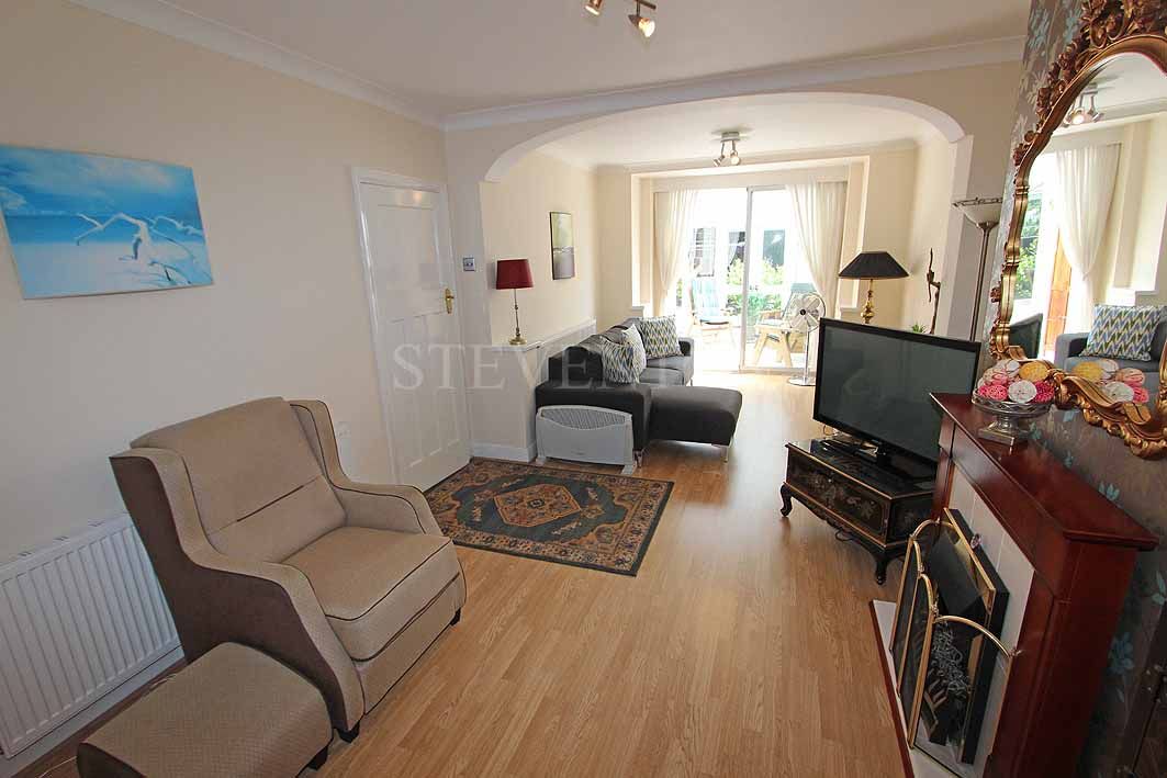 25’ 8’’ ( 7.82m ) x 11’ (3.35m) Into the front Bay window, fireplace, laminate flooring, coved ceiling, two radiators, archway, power points, sliding patio door leading into a: