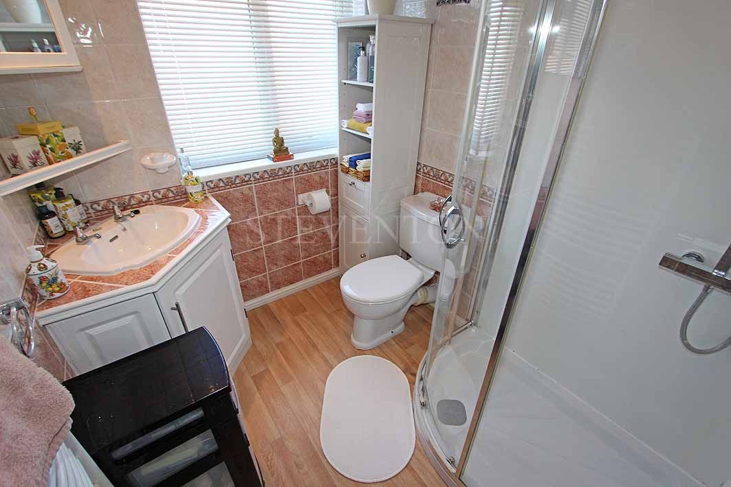Having a corner shower cubicle, close coupled W.C., wash hand basin with tiled insets and a cupboard under, heated towel rail,coved ceiling, ceiling lights, extractor and a upvc double glazed window.