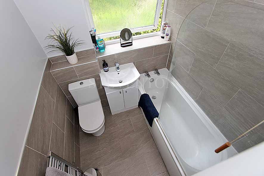 Having a fitted white suite and comprises a panel bath with a shower and glass screen, low flush toilet, wash hand basin with cupboards under, part wall tiling, tiled display sill, heated towel rail, upvc double glazed window.
