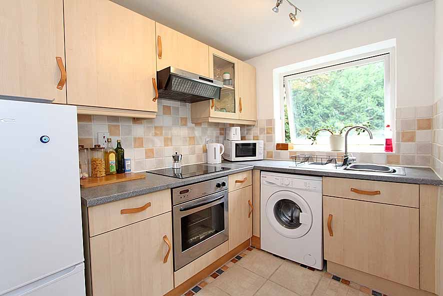 9’ ( 2.74m ) x 6’ 5’’ ( 1.95m ) Single drainer sink unit, floor and wall cupboards, oven, hob unit and cooker hood, plumbing for a washing machine, shelved larder and airing cupboard, part wall tiling, tiled flooring, power points, upvc double glazed window.