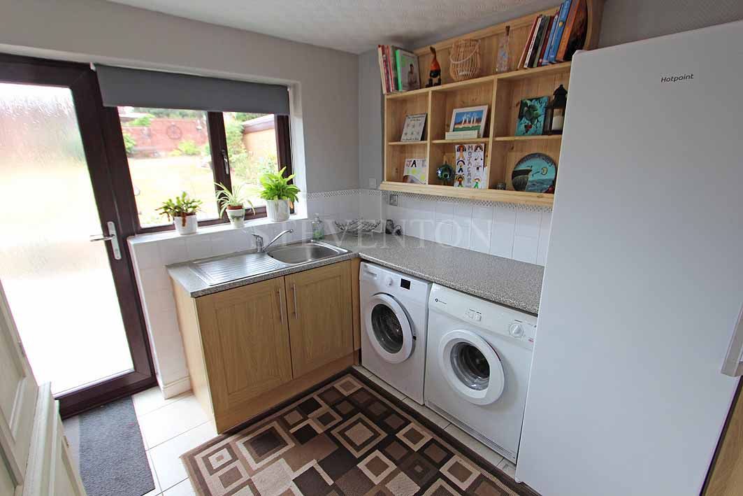 8’ 11’’ ( 2.71’ ) x 8’ 10’’ ( 2.69m ) Single drainer sink unit with cupboards below, wall mounted display unit, shelved larder unit, work top with plumbing for a washing machine below, tiled flooring, part wall tiling, loft access, power points and a upvc double glazed door leading to outside and side window.