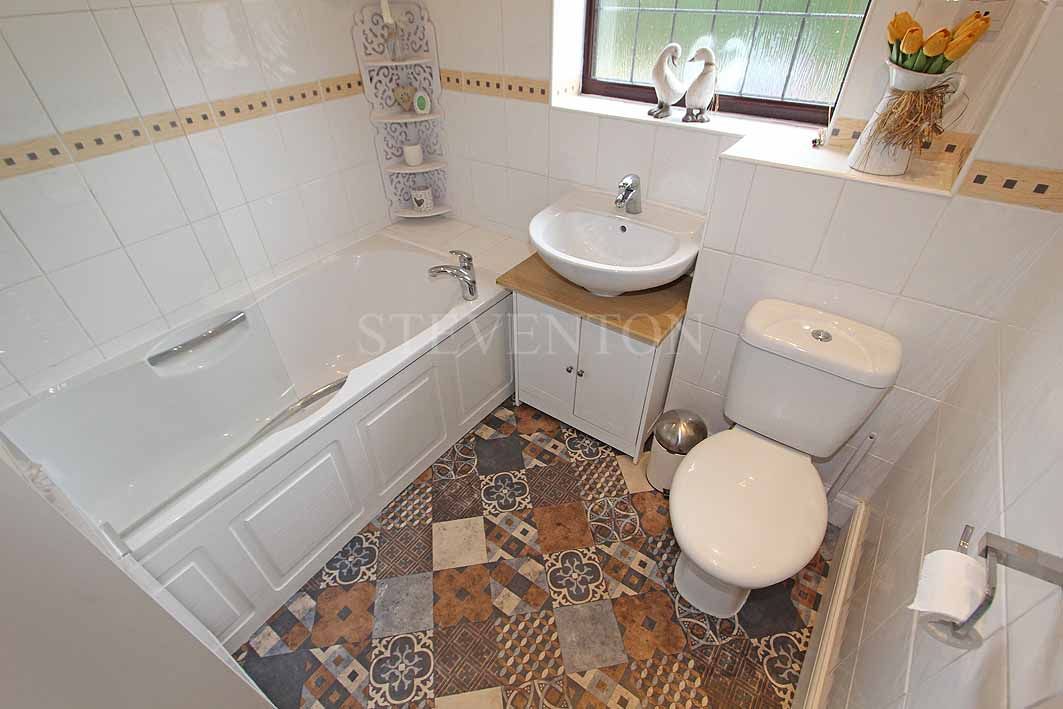 Having a Panel bath with a shower and glass screen, low flush toilet, wash hand basin with cupboards below, heated towel rail, wall tiling, shaver point, extractor and a leaded upvc double glazed window.