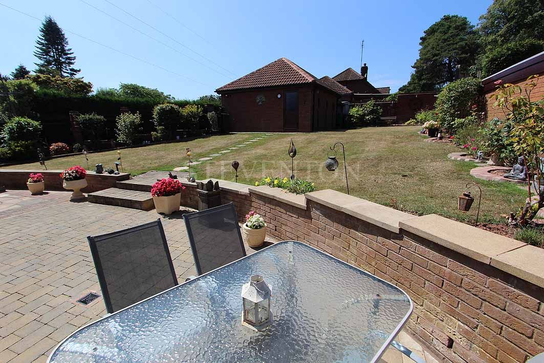 Has an extensive shaped patio area with dwarf walls and steps leading up onto the lawn and there is a second raised rear patio area and stepping stones leading up to the garage. The garden is surrounded by a variety bushes, shrubs and plants to the borders and creates a most pleasant outlook. Two side gates and a water tap.