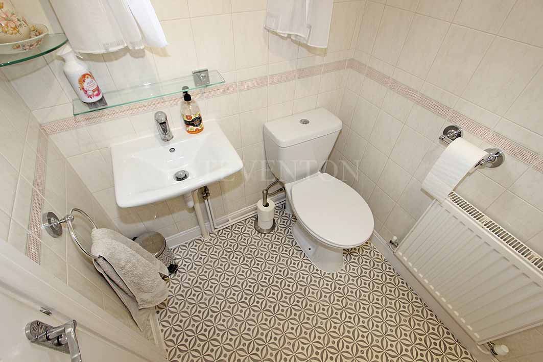 A white suite having a low flush toilet, wash hand basin, double door cloaks/linen cupboard with shelves and hanging rails, full wall tiling, coved ceiling, radiator and a circular glass and leaded light oriel window.