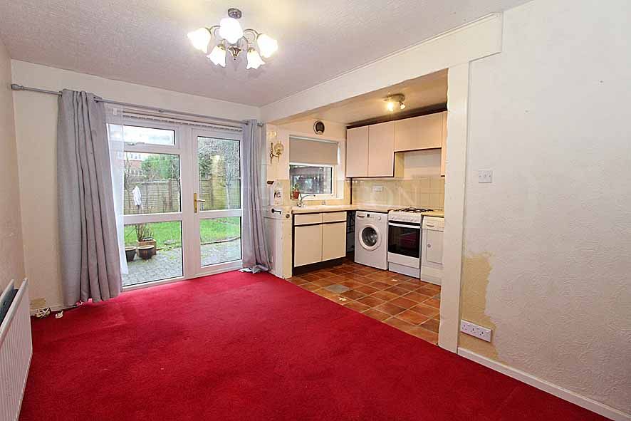 9’5’’ (2.87m) x 6’1’’ (1.85m) having fitted range of wall and base units, single drainer sink unit with H&C mixer tap, rolled edge work surfaces, space for cooker, tiled splash backs, space and plumbing for washing machine, UPVC double glazed window overlooking rear and open access to: