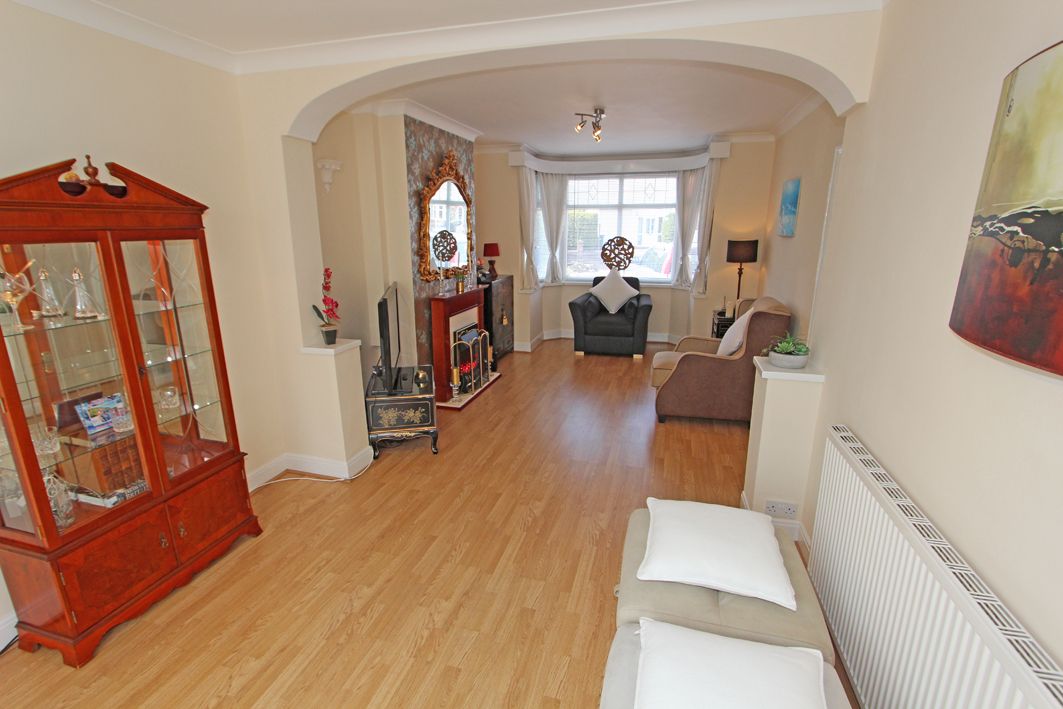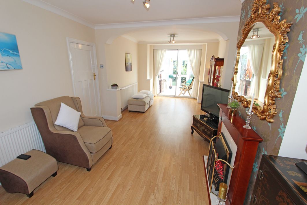 25’ 8’’ ( 7.82m ) x 11’ (3.35m) Into the front Bay window, fireplace, laminate flooring, coved ceiling, two radiators, archway, power points, sliding patio door leading into a: