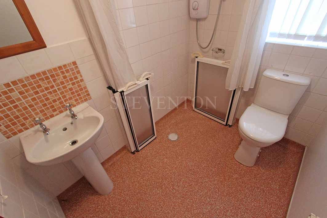 Shower area with folding screens, rail and curtain, low flush toilet, pedestal wash hand basin, part wall tiling, double glazed window.