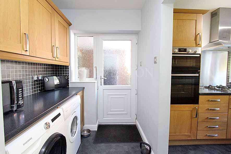 9’ (2.74m) x 7’10” (2.39m) having comprehensive fitted range of wall, base and drawer units, rolled edge work surfaces, 1 1/2 bowl sink unit with H&C mixer tap, stainless steel four ring gas hob with chimney style extractor hood above, double oven, tiled splash backs, space for fridge, gas fired heating boiler (recently refitted) and UPVC double glazed window overlooking rear.