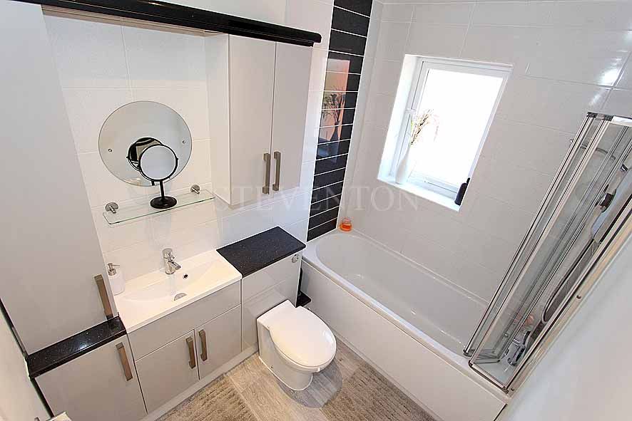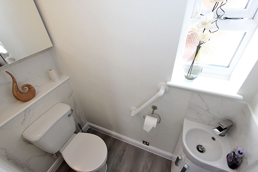 having fitted white suite with complementary chrome fittings comprising; close coupled W.C, corner vanity unit, part tiled walls, wall light point, chromed ladder radiator and UPVC double glazed opaque window overlooking side.