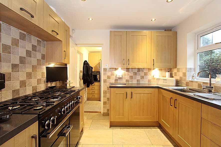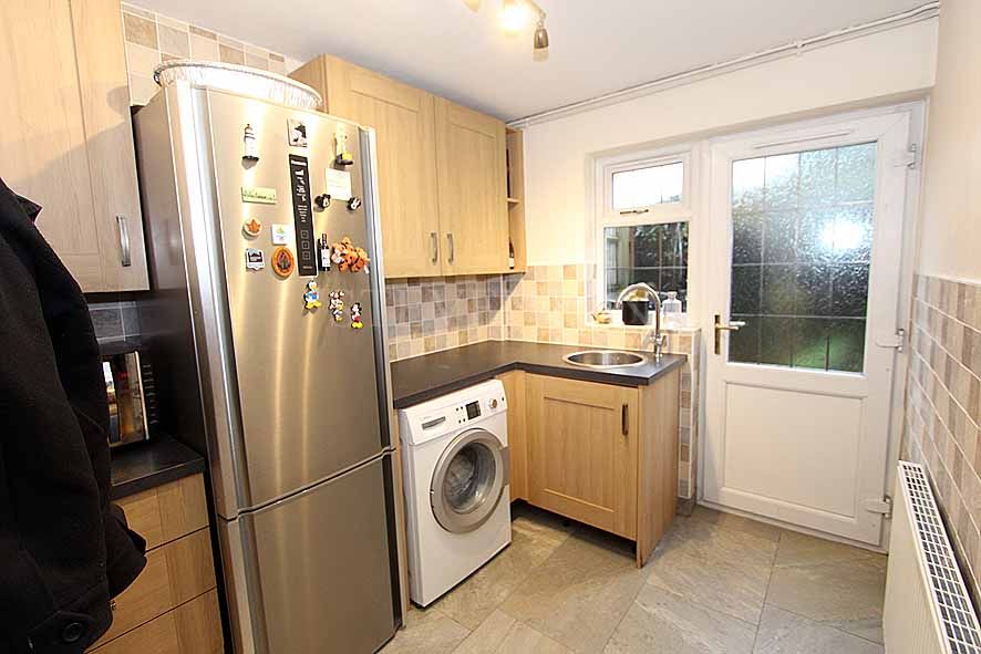 8’9” (2.67m) x 7’2’’ (2.18m) having fitted range of wall, base and drawer units, marble effect working surfaces, single bowl sink unit with H&C mixer tap, space and plumbing for washing machine, space for fridge/freezer, part tiled walls, tiled flooring, radiator, door leading to garage and UPVC double glazed door with matching side window leading onto rear garden
