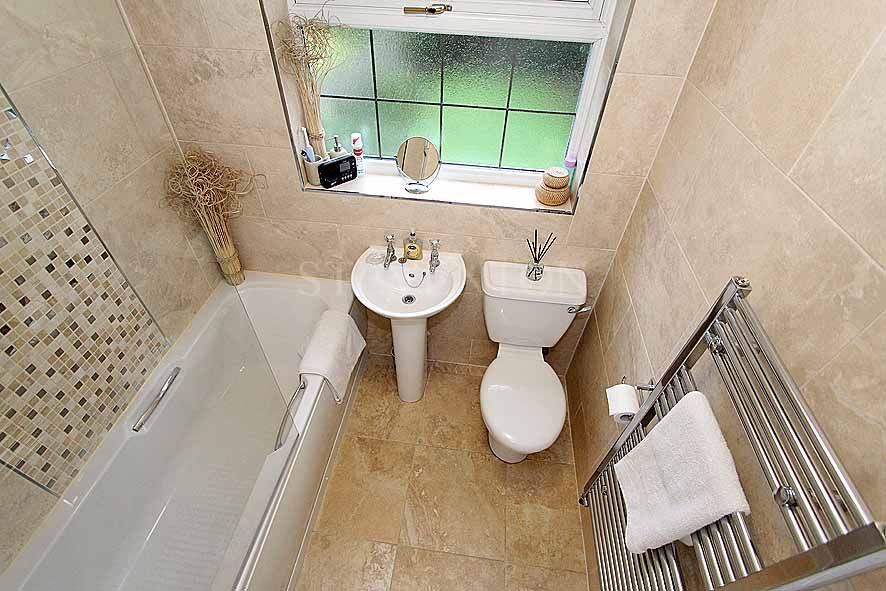 having fitted white suite with complementary chrome fittings comprising; panel bath with H&C mixer shower and glazed shower screen, pedestal wash hand basin, close coupled W.C, tiled walls, tiled flooring, chrome ladder radiator and UPVC double glazed window overlooking rear.