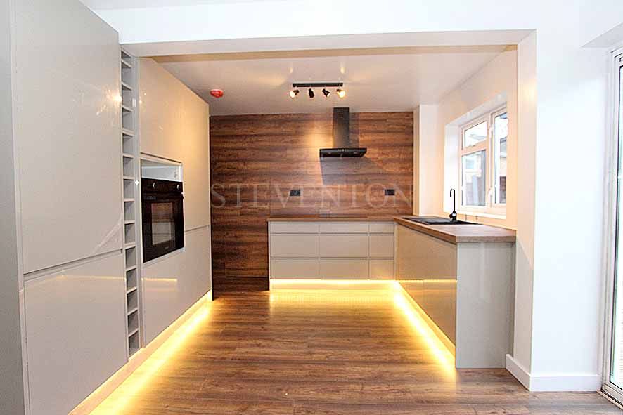 16’2’’ (4.93m) x 10’10’’ (3.30m) having comprehensive refitted range of units, working surfaces, single drainer sink unit with H&C mixer tap, four ring electric hob, chimney style re-circulating extractor hood above, under unit lighting, under stairs storage cupboard, laminated flooring, radiator, UPVC double glazed window overlooking rear, double glazed sliding patio door leading to rear garden and concealed door leading to: